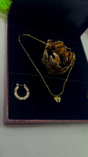 Embrace the beauty of nature with The Gilded Flutter Ensemble. This complete gold-toned set is inspired by the delicate grace of the butterfly, making it a whimsical yet sophisticated addition to any collection.